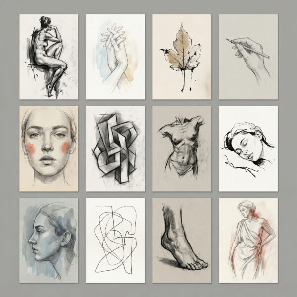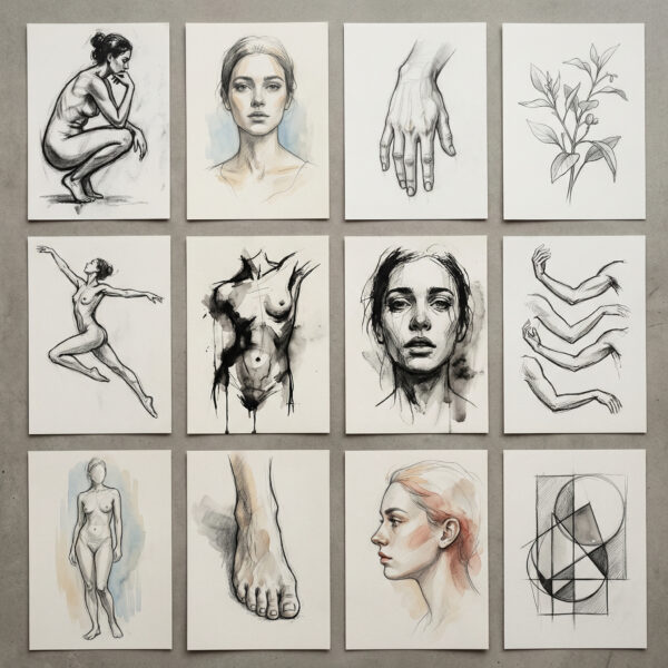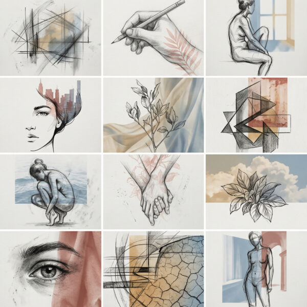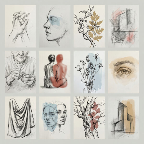 This series brings together ink, charcoal, and pencil studies shaped by the streets of Queens. Each drawing explores light, structure, and memory through expressive line work and subtle hints of color. The grid format reflects a working sketchbook—intimate, textured, and intentional—where architecture, botanical forms, and urban rhythms unfold with restraint and confidence.