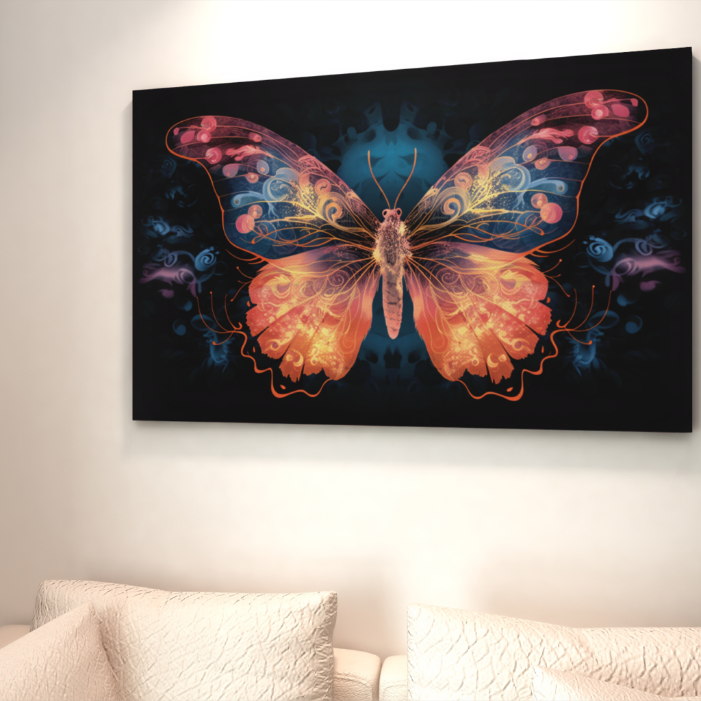 This image of a glowing butterfly, embodying whimsy tinged with an eerie allure, speaks to the enigmatic beauty found within the contrast of light and darkness. Dark cyan and orange hues interplay to create an atmosphere of mystery and depth, enhancing the butterfly’s ethereal glow.