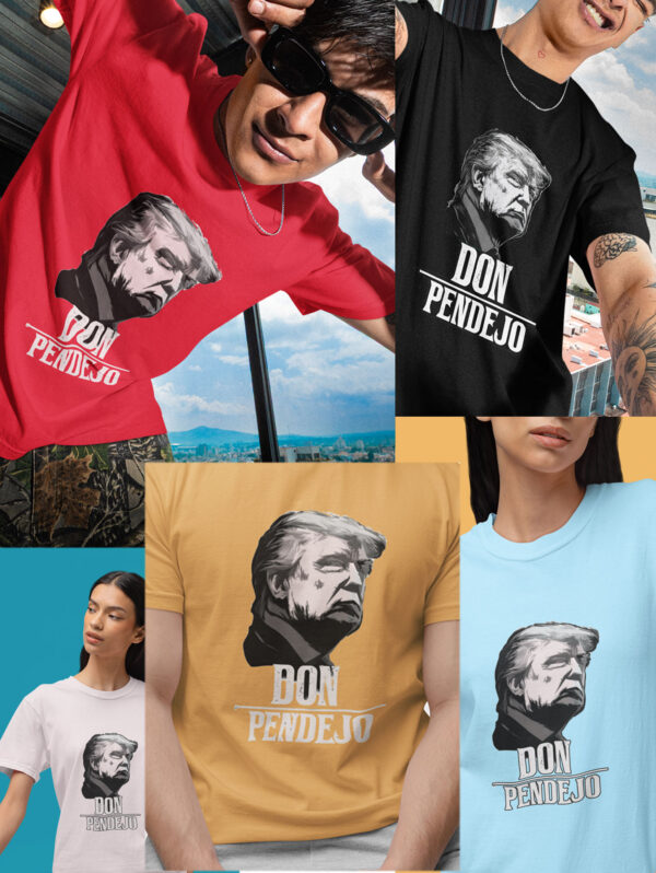 This is a bold political parody artwork featuring a monochrome portrait of this controversial figure. With the phrase “Don Pendejo” it is a striking graphic commentary piece blending satire and minimalism in a Godfather-inspired poster aesthetic. Click to purchase. 100% satisfaction guaranteed!