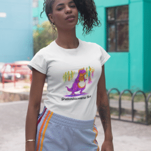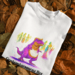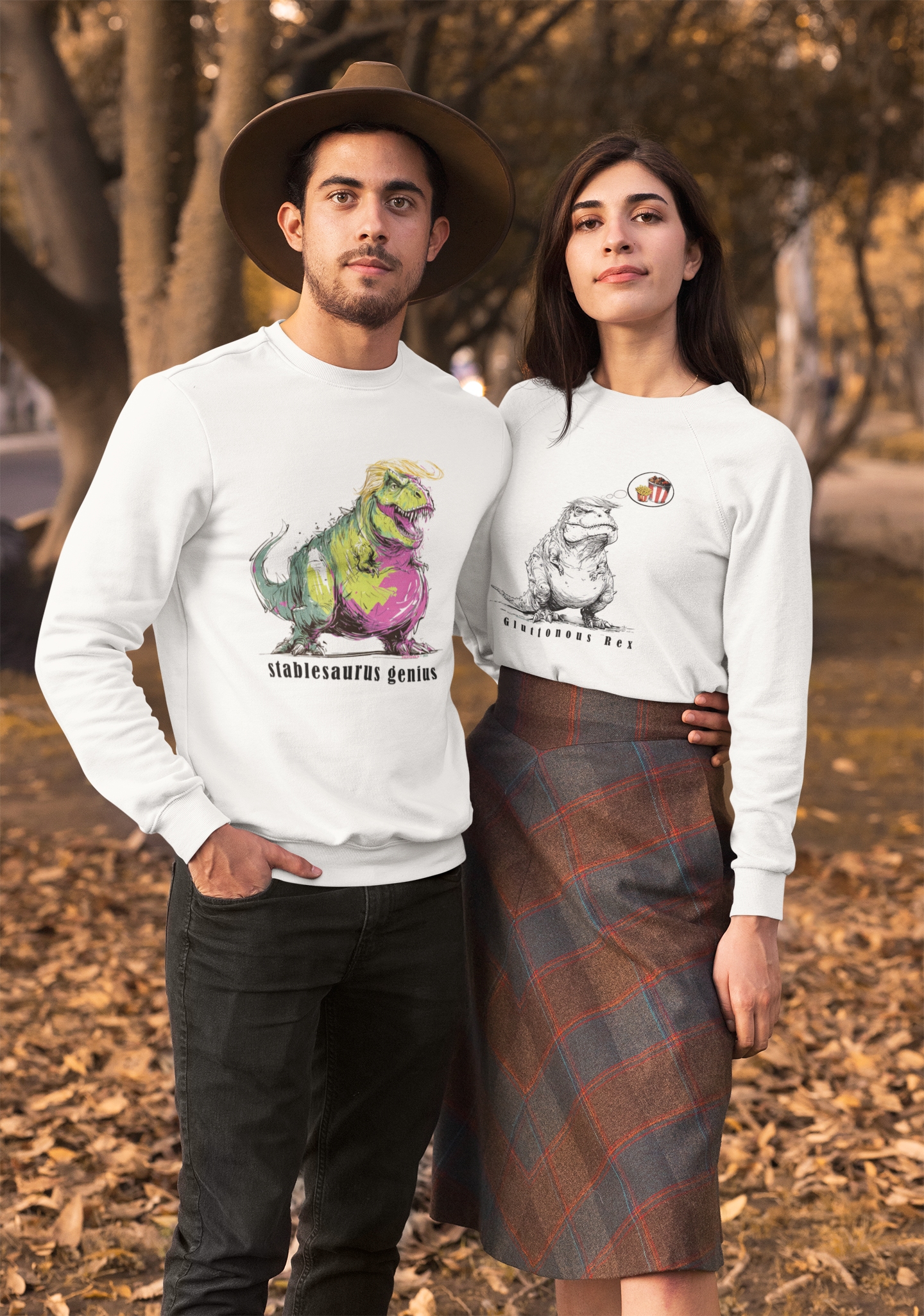 “Gluttonous Rex” is a cartoonish T-Rex with questionable hairstyle thinking about fried chicken and fries. Wear it outdoors holding an American flag, calling for freedom & satire.