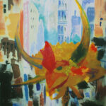 Feeling like a chicken without a head is a common experience of those who first arrive to the city. This piece presents a vivid, surreal scene where a flamboyant chicken becomes a vejigante mask—painted in fiery reds, golds, and oranges. The head floats through an abstracted urban landscape of New York City. Feeling like a chicken without a head is a common experience of those who first arrive to the city. Buildings are massive and The Flatiron Building rises ghostlike in the background, its iconic triangular form softened by expressive brushstrokes of blue, lavender, and white. The contrast between the playful, horned mask and the monumental city architecture creates a vibrant collision of cultural iconography and modern urban space.