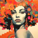 The bright colors and intricate designs create a dynamic and captivating aura, celebrating Afro-centric beauty and cultural heritage with a modern, artistic twist. The overall effect is both stunning and elegant, blending natural elements with abstract art in a harmonious and visually engaging way.