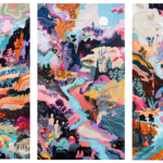 Here is a vibrant and colorful landscape filled with surreal, whimsical creatures and plants in the style of a psychedelic garden! I created a series of scenes that includes rivers, mountains, forests, clouds, stars, rainbows, plants, animals, patterns, and intricate details. These are 3 separate pieces; together or separate, it is an abstract artwork that uses bold colors to create depth and texture. It has a dreamlike quality with soft lighting that casts gentle shadows on its surface. In the background there is a night sky.