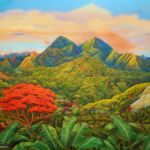 The scene is inspired on the morning lights over the mountains of Cayey and it’s iconic duo commonly known as las Tetas de Cayey.