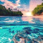 Moving Lights of the Caribbean (2024) Digital Painting. This stunning artwork presents a breathtaking tropical paradise, where the harmony between land and sea is vividly captured. Above the water, the sky is a canvas of warm oranges and pinks, suggesting a serene sunset, while lush green foliage and swaying palm trees frame the scene, creating a sense of secluded tranquility. Below the surface, the clear turquoise waters reveal a lively aquatic world teeming with fish, swimming amongst coral reefs. The sun’s rays penetrate the water, creating dancing patterns on the sandy sea floor and highlighting the vivid colors of the marine life. This image evokes a feeling of peace and the beauty of untouched natural environments. Dimensions: 24 x 32 inches