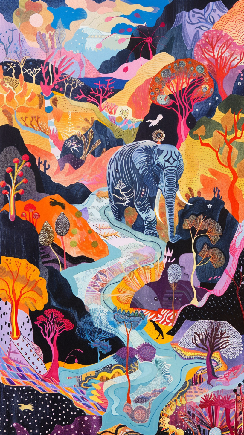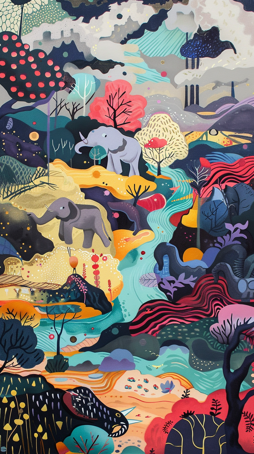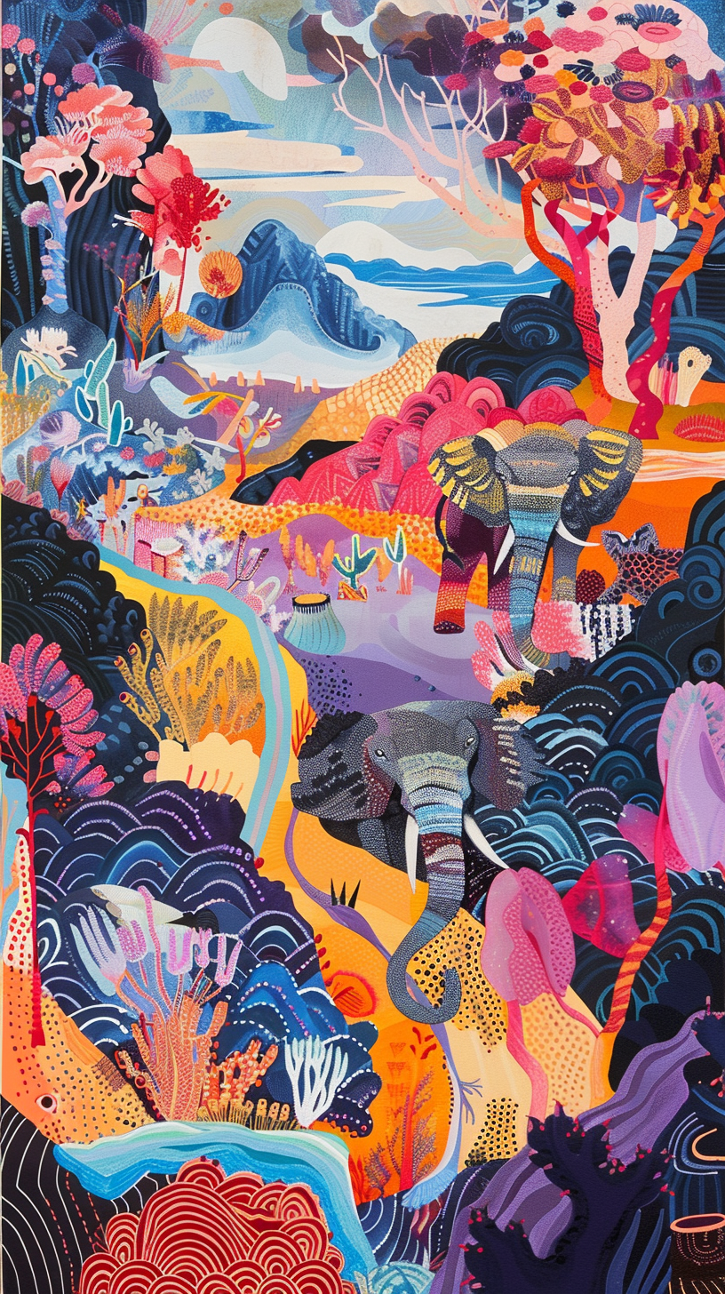 A vibrant and colorful landscape filled with whimsical creatures and plants in the style of a psychedelic garden! I created a series of scenes that includes natures’ totality: rivers, mountains, forests, clouds, stars, rainbows, plants, animals, patterns, etc. But the main inspiration were the Elephants. I wanted to give them a fantastical, psychedelic and surreal space.This is an abstract artwork that uses contrasting bold colors and patterns to create depth and texture. It has a dreamlike quality with soft lighting that casts gentle shadows on its surface. These are available in a variety of papers!Quick View -